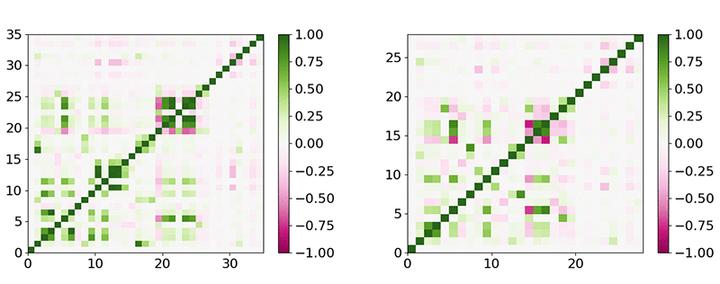 上图中的左图表示某些特征(例如价格和某些预测指标)是共线的,其中ρ> 0.95。设计下一节中描述的ML模型时,我只保留了其中的一个,这给了我留下了大约30个特征,如上图中的右图所示。