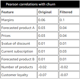 下表显示了特征和客户流失之间的最高相关性和二进制差异。48个原始特征和派生特征中仅显示最重要的特征。“ Filtered“列包含对异常值和缺失值进行数据过滤时获得的结果。