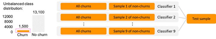 - 在第二种方法中(如下图所示),我将训练基于模型的集合,其中每个模型使用9个丰富类的随机样本(不进行替换)和稀有类的一个完整样本。我之所以选择9倍,是因为类别的不平衡程度大约是1比9(如下图的直方图所示)。因此,1-9是使用丰富类中的全部或几乎所有数据所需的采样量。这种方法比较复杂,但是会使用所有可用信息,从而提高了通用性。我将在以下面章节中评估其有效性。