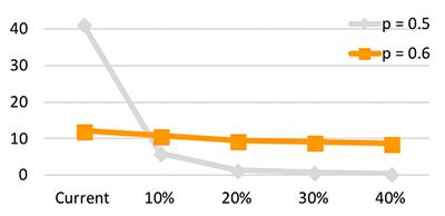 当我将模型的p阈值设置为0.6以使损失最小化至10%时,我的分析预测20%的折扣会减少25%的客户流失。假设在此阈值下的真阳率约为30%,这个分析表明采用20%的折扣方法可以消除至少8%的客户流失。有关详细信息,请参见下图。折扣策略是遇到客户流失的企业可以考虑采取的缓解问题的简单的第一步。