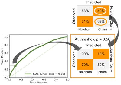 查看ROC曲线,您可以看到同一模型可以准确预测30%的客户流失,而将非流失客户预测为流失客户的概率为10%。使用网格搜索,我发现阈值为p = 0.56。如果您想最大程度地减少高估会流失客户数量的风险(例如,由于我们为保留这些客户而进行的活动可能会成本很高),则可能要使用此模型。