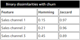 可以通过使用边际相关和Hamming / Jaccard距离来处理低方差特征(当流失标签更改时不会显着变化的特征),如下表所示。Hamming / Jaccard距离是专门为二进制结果设计的相似性度量。这些措施提供了一个观点,即每个特征对客户流失提供了多大程度的信息。