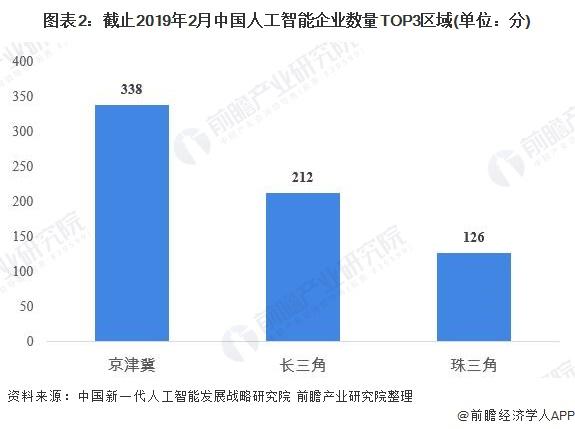 在人工智能企业数量上,京津冀也居于榜首,截止2019年2月,共有338家。长三角和珠三角企业数量分别为212家和126家。