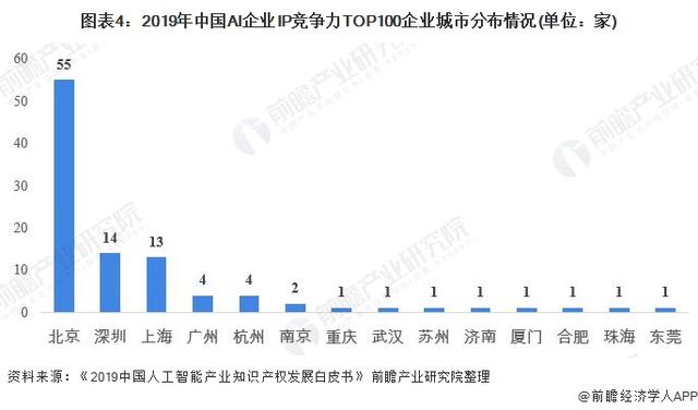 据汇桔网和胡润百富携手合作发布的《2019中国人工智能产业知识产权发展白皮书》数据显示,2019年中国AI企业IP竞争力TOP100企业分布于我国北京、深圳、上海等14个城市,其中北京以55家排名第一;其次是深圳和上海,分别有14家和13家。