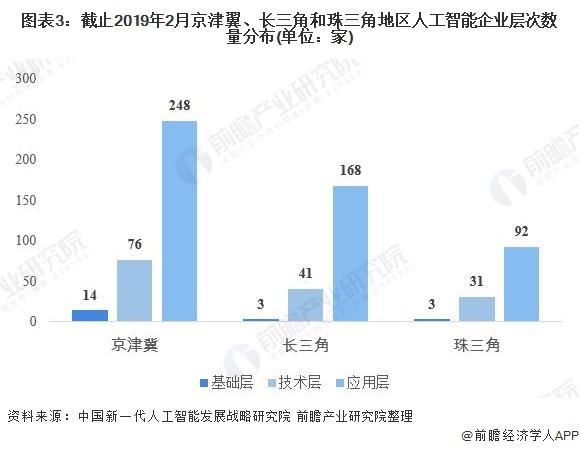 但是,京津翼、长三角和珠三角三大地区人工智能企业均以应用层为主,技术层企业数量少。这也是我国人工智能行业目前的发展现状,应用层发展较好,技术层相对薄弱。截止2019年2月,京津冀共有14家人工智能技术层企业,76家人工智能技术层企业和248家人工智能应用层企业。长三角地区的人工智能基础层、技术层、应用层企业数量分别为3家、41家、168家;珠三角地区基础层、技术层、应用层企业数量分别为3家、31家、92家。