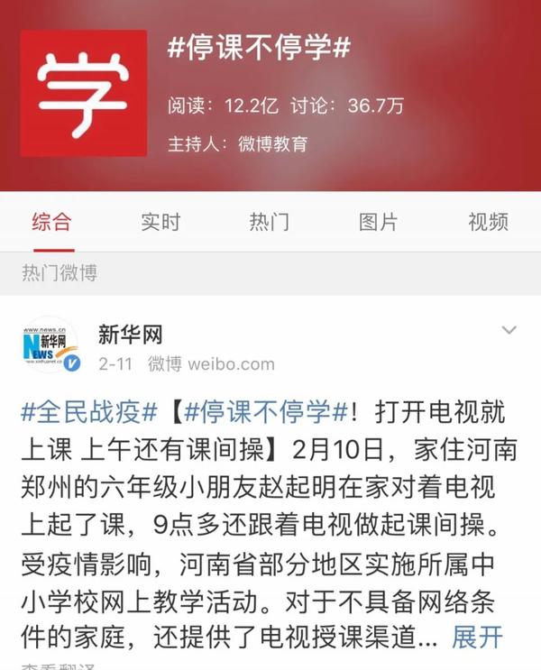 目前在微博上“停课不停学”的话题已有36万的讨论,阅读量达到12.1亿。