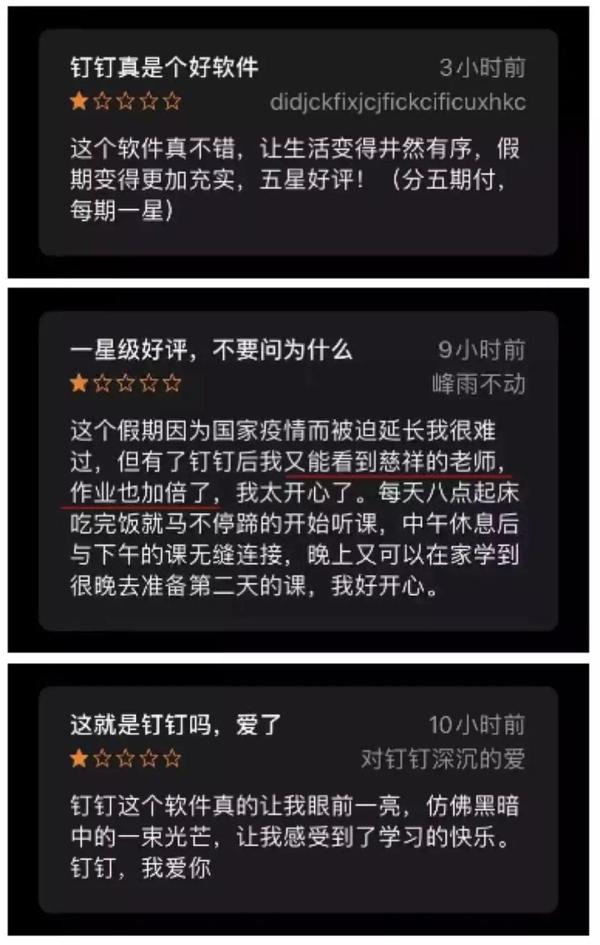 另一方面小学生们也没闲着,不甘心寒假时间被占用上网课,于是集体出征,组团去各大应用商店给“钉钉”打一分。于是就出现了前几天的“钉钉十一亿下载量,整体评分只有一星”,真是好惨一软件。