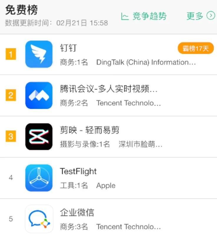 截止到2月21日,在中国 App Store 排行榜中,钉钉超过微信连续17天霸占免费软件榜单第一。幸福来得太突然,原本定位是办公软件的钉钉就这么出圈了。