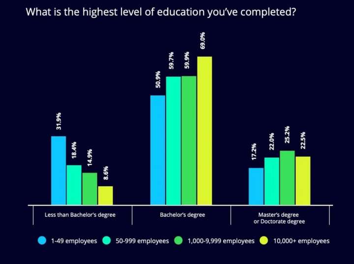 - 小公司中 31% 的开发人员没有学士学位(在美国也被称为「本科学位」或「四年制学位」);