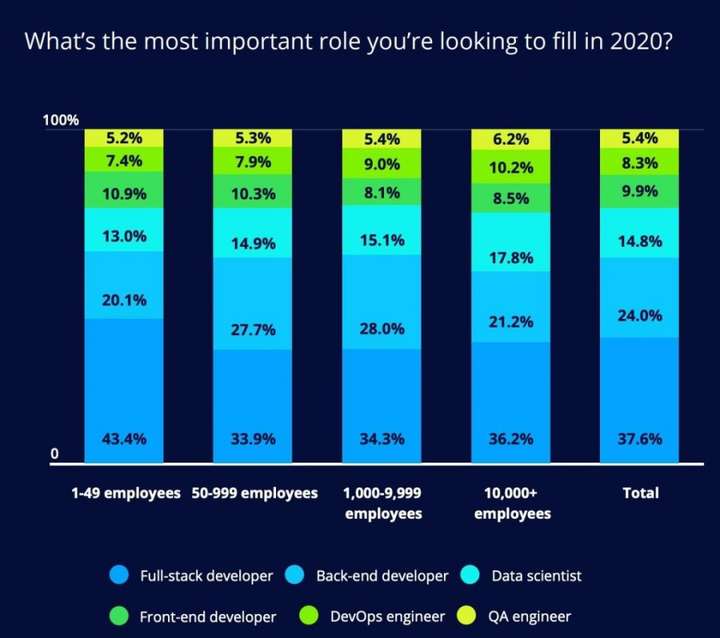 HackerRank 的《2020 年开发者技能报告》(2020 Developer Skills report) 中的图表显示,对于较小的公司(少于 50 名员工)来说,43% 的公司认为全栈开发者是他们最想雇佣的人。