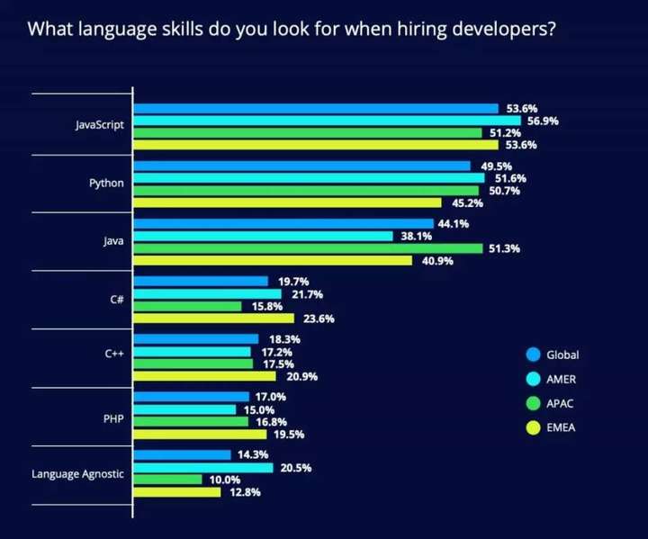 上图按地区列举了招聘经理对语言的看重程度,JavaScript 是最受欢迎的语言,紧随其后的是 Python 和 Java。