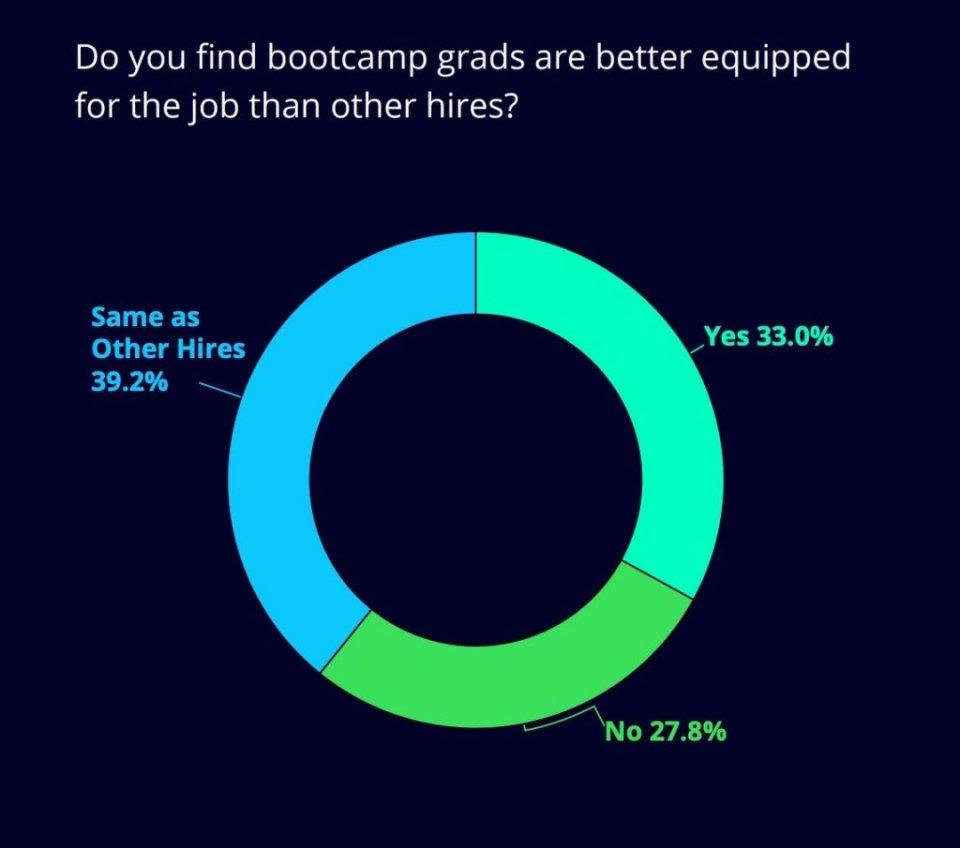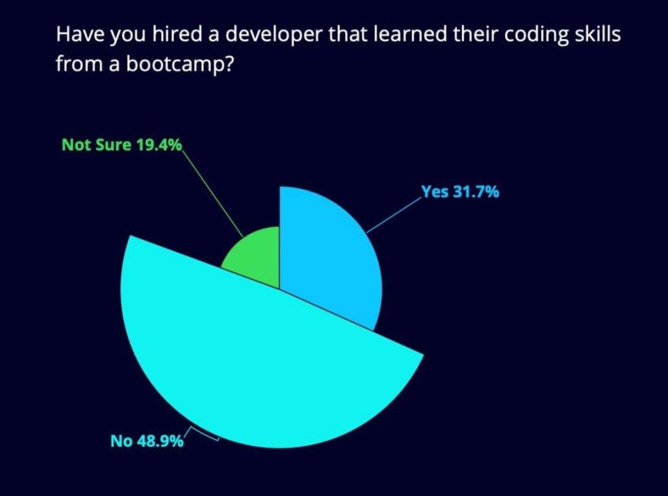 图表显示,在接受调查的招聘经理中,近 32% 的人曾聘用过一名参加过编程训练营的开发人员。