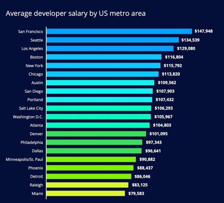 以下是美国城市中开发者的平均工资: