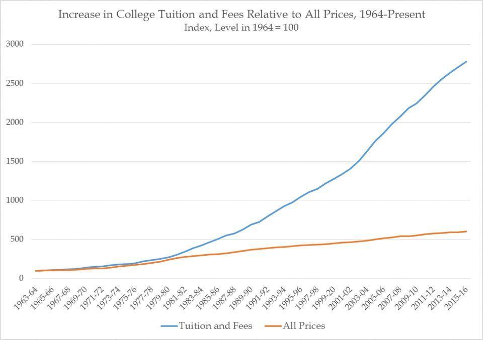 这与上世纪 90 年代和 21 世纪初的情况有很大的不同,当时大多数开发人员的工作都对学位有所要求。但是细想下来,这也是完全有道理的。在过去 40 年里,获得大学学位(尤其是在美国)的成本飙升。