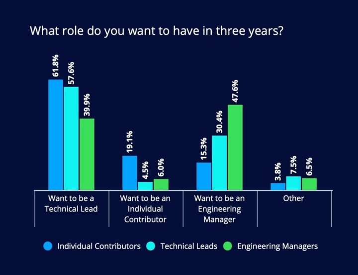 图表显示 59% 的开发人员希望在工作中学习新的技术技能。这个数字比那些主要想要获得证书、开发软技能或得到晋升的开发人员的数量要大得多。一言以蔽之:技能。大多数开发人员不太关心职业发展的传统标志(晋升)。他们更关心如何扩展自己的技术技能。
