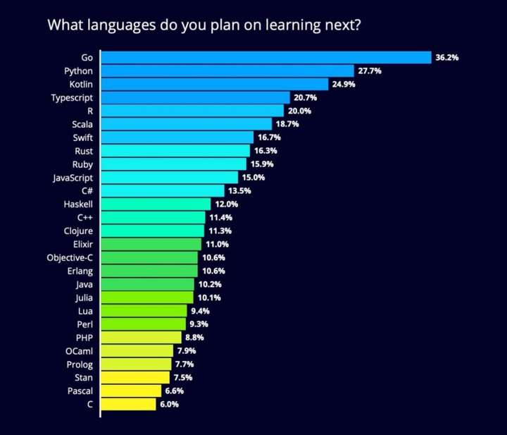 如上图所示,36% 的开发者希望接下来学习 Go,然后是 Python 和 Kotlin。