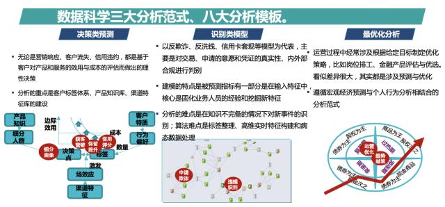 其中“业务检测”包括KPI指标体系的构建和可视化分析能力,“诊断”涉及定性和定量根因分析和研究报告编写,“指导”包括客户画像、产品画像和策略模版的使用,“工具”包括金融行业定制化的八大数据挖掘模版的学习和使用。
