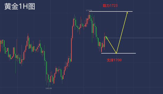从小时线走势来看,目前小时线短期触底反弹小幅拉升,报价1706,依托布林中轨下方运行,短期1700形成底部支撑,金价只要不破这一线,大跌的可能性比较小,守住的话,必然有一波小幅反弹拉升,小时线暂时关注1700-1717,重点关注非农高低点1723-1700,那边破位行情倾向于那边掌握主导权就看往哪个方向突破。