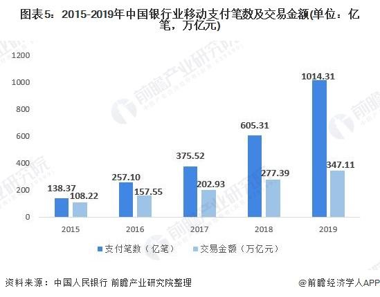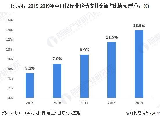 各大银行为应对第三方支付机构的竞争,也加紧推出移动支付功能及应用,在2016年后相继推出了华为付、小米付、Apple pay、三星付等一系列移动支付功能。据中国人民银行数据显示,近年来中国银行业移动支付金额占比有了明显的提升,从2015年的5.1%上升到2019年的13.9%。2019年中国银行业移动支付笔数高达1014.31亿笔,实现347.11万亿元的交易额。