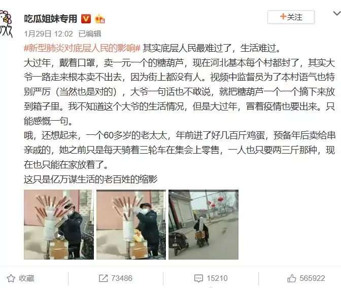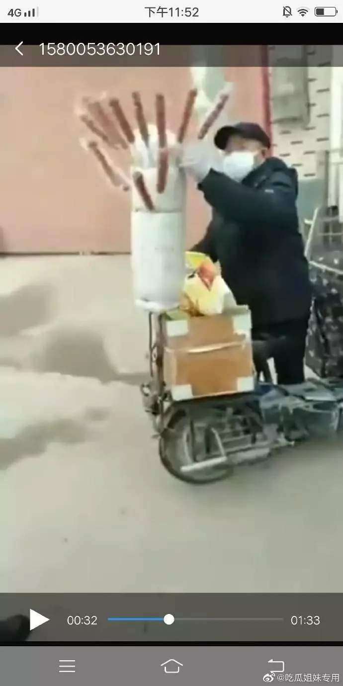 她说,在河北农村,有一个老大爷戴着口罩骑着电动车,到处叫卖一元一个的冰糖葫芦。