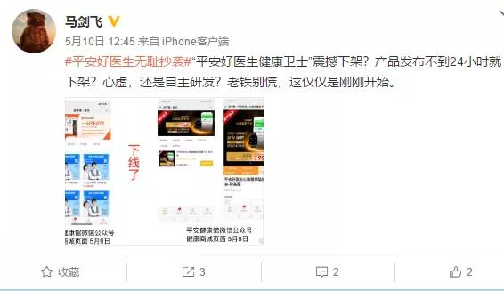 虽然平安好医生矢口否认“抄袭”,但5月10日马剑飞发布微博称,平安好医生健康卫士发布不到24小时就下架?心虚还是自主研发,这仅仅是刚刚开始。