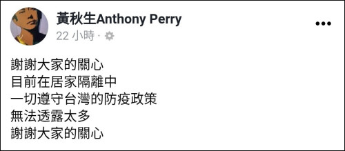 据悉,艺人黄秋生凌晨时分在脸书平台发文,称自己已经抵达台湾,将会在酒店中自主隔离14天。