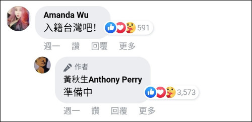 还有网民向他喊话“入籍台湾吧”,黄秋生竟也回复说:准备中。