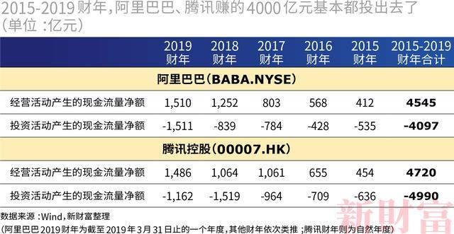 其次,TMT巨头们通过大规模投资营造周边生态,2015-2019财年间,阿里巴巴合计创造了4545亿元净现金流;同期却净投资了4097亿元!相当于赚的钱90%净投了出去。