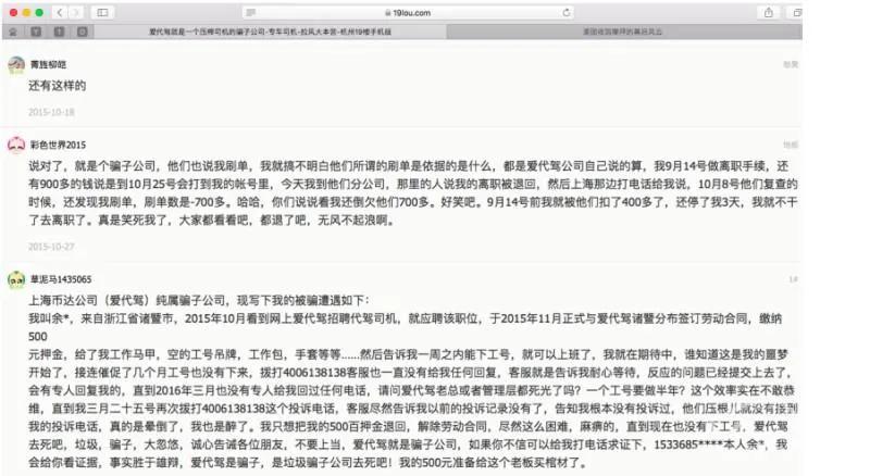 此外,有司机和用户在网上公开曝光爱代驾等情况。