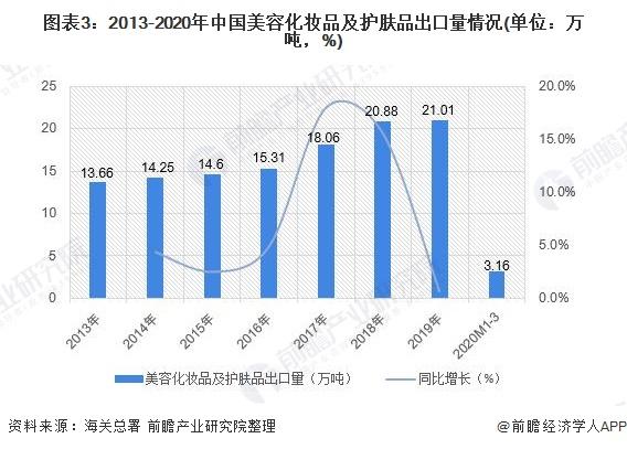 2013-2019年中国美容化妆品及护肤品出口量稳步增长,2013年中国美容化妆品及护肤品出口量为13.66万吨,到2019年出口量达21.01万吨,2013-2019年美容化妆品及护肤品出口量复合增速达7.4%。截至2020年3月,我国美容化妆品及护肤品出口量为3.16万吨。