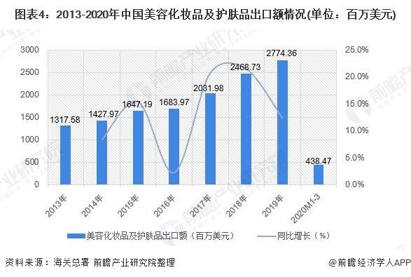 从金额方面来看,2013-2019年中国美容化妆品及护肤品出口金额呈增长趋势,2013年中国美容化妆品及护肤品出口金额为1317.58百万美元,到2019年中国美容化妆品及护肤品出口金额达2774.36百万美元。截至2020年3月,我国美容化妆品及护肤品出口额为438.47百万美元。