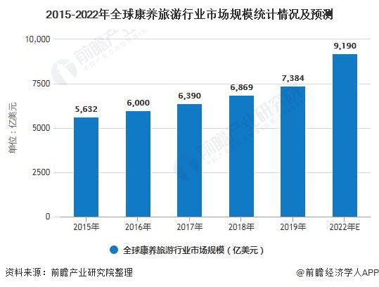 其中,2017年,全球康养旅游市场规模为6390亿美元,预测到2022年将达到9190亿美元,年复合增长率为7.5%。
