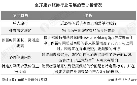 2019年1月,健康旅游协会(WellnessTourismAssociation,WTA)对其成员进行了调查,并发布了一份关于“健康假期”的报告,揭示了五个关于康养旅游发展趋势。包括:单人旅行,外来游客增加,停留时间更长以及灵活度更高,心理健康问题,特定方案需求及价值主张明确等。
