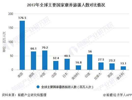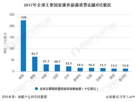 康养旅游业主要分布在北美、欧洲和亚太地区的几个国家,排名前五国家分别为(美国、德国、中国、法国、日本),占全球市场的59%,仅美国一个国家就占据了全球收入的三分之一以上。