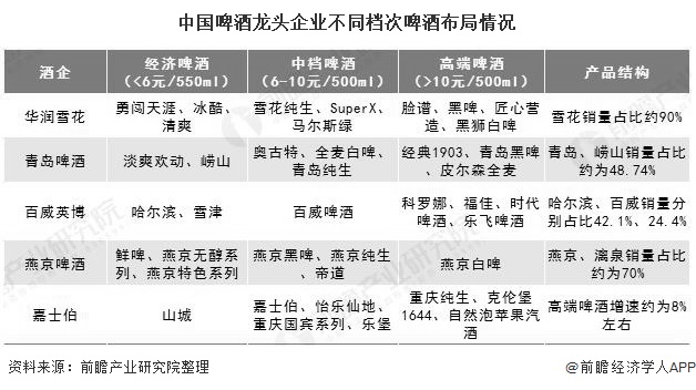 近年来,我国居民人均可支配收入逐渐增多,在消费升级的推动下,对中高端啤酒的需求日益提升,我国啤酒龙头企业优化产品结构,纷纷推出中高端产品,布局中高端啤酒市场。青岛啤酒先后研发了经典1903、青岛黑啤、皮尔森等高端产品,价格在10元/500ml以上;华润雪花陆续推出了脸谱、黑啤、匠心营造等产品,在中高端市场加速布局。