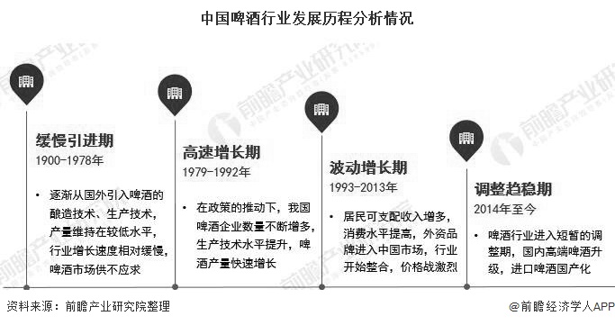 从啤酒的发展历程来看,我国啤酒行业经历了缓慢引进、高速增长、波动增长和调整趋稳四个时期,目前我国啤酒行业正处于调整趋稳期。