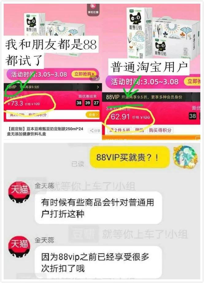 3月7日,某用户表示,在购买同一款豆奶产品时,其与朋友作为88VIP会员,购买页面显示价格为73.3元,普通淘宝用户下单价格为62.91元。该用户在与客服沟通中,被告知“有时候有些商品会针对普通用户打折,因为88VIP之前已经享受过很多次折扣了”。