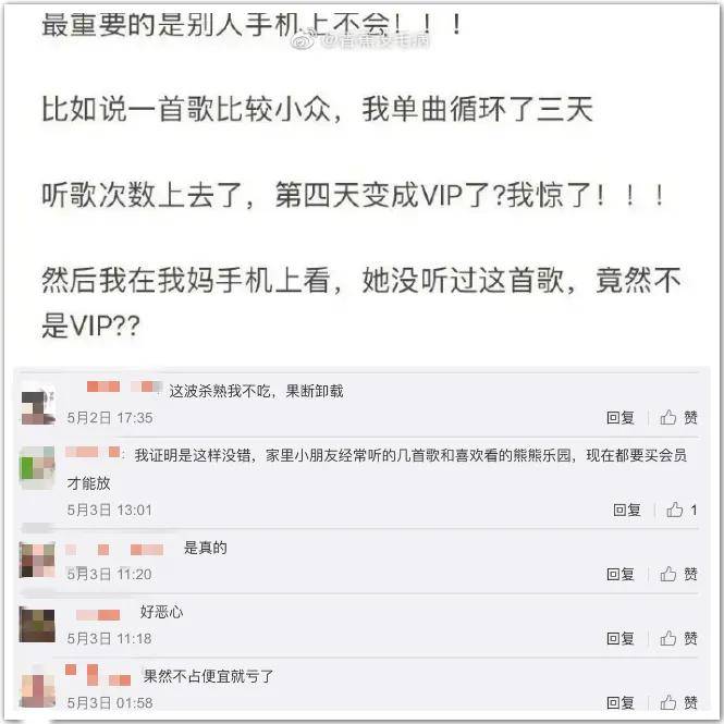 有网友提到,自己悄悄听的歌会变成VIP,单曲循环三天,听歌次数上去了,第四天就变成VIP了,没听过这首歌的母亲手机上这首歌不是VIP。