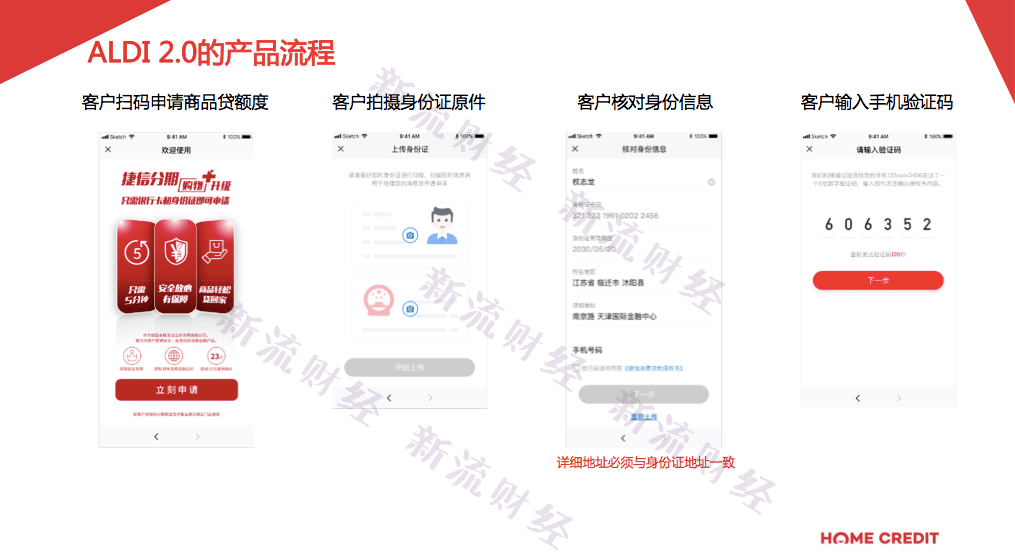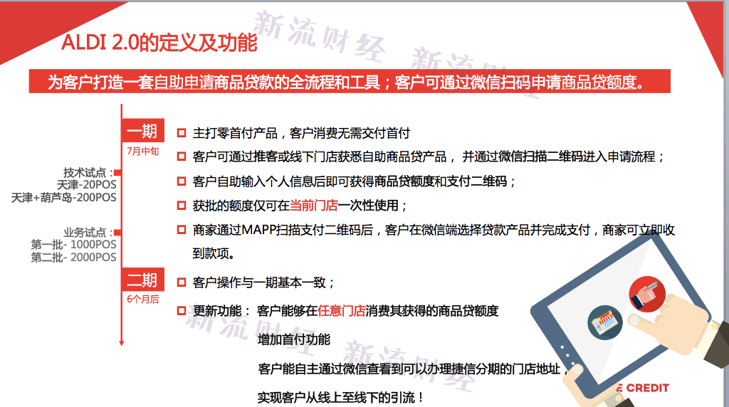 据一位区域经理提供的一份捷信ALDI2.0模式内部资料显示,ALDI2.0模式主打零首付信贷产品,类似虚拟信用卡,可通过支付二维码在线下商户消费,流程中突出客户“自助”申请贷款性质,比起最早的模式,最大程度的减少了线下人员的参与和辅助。