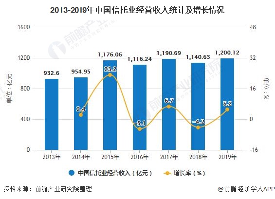 2019年,我国信托业在金融供给侧结构性改革的引领下,整体经营状况良好,风险水平总体可控,高质量发展和服务实体经济能力进一步提升,实现了向高质量发展转型的良好开局。整体来看,2013-2019年我国信托业的经营收入呈现波动变化态势,其中2019年我国信托业实现经营收入1200.12亿元,同比增长5.2%。