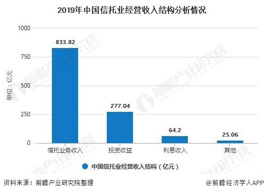 从信托业的经营收入的结构来看,2019年中国信托业务收入仍然占据主导地位,其收入达到833.82亿元,占总经营收入的69.48%。其次是投资收益部分达到277.04亿元,占总经营收入的23.08%。