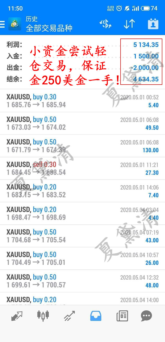 这是黛清的一个实盘学员,之前做过的平台也有七八个了,几万美金大资金也入过,5000美金的账户也尝试过,也确实对市场心存困惑。找到黛清的时候,客户说能不能入金1500美金先试试,自己之前亏得实在是太多了。五月初客户入金,经过一个月的交易,总盈利达到5000余美金,并且出金2000美金。经过一个月的交易,客户也认可了黛清的能力,接下来就用盈利的金额继续交易!