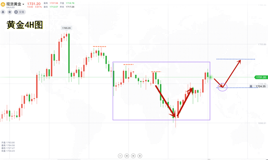4小时来看,打破了三角区的僵局;MACD金叉,红色能量柱扩张,KDJ金叉随机指标走高,指示黄金接下来将维持旗形看涨形态;KDJ也运行在超买区域,短线仍然需要警惕金价震荡回调的可能,下方初步支撑在1720关口附近,该位置同时靠近60日均线,具有一定支撑力度,若下破,则削弱短线看涨信号。黄金目前已经破位了下跌通道趋势线上方,破位一路上涨至1733的高点一线,正在逼近4小时上轨1739的压制,该位置也是本周的高点回调位,谨防出现高位回调。且价格MA5日线开始拐头,下方MA10日与20日线交错,当前MACD在零轴下方金叉,KDJ三线有拐头向下的趋势,虽然昨日黄金反弹表现不错,但未改变短期下跌的趋势,这样的行情相信很多人都不好把握,那我告诉大家箱体震荡的行情利润空间就把握到止损为止。综合来看,下周一短线操作上夏黛清建议以回调做多为主。
