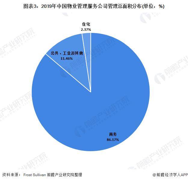 在物业管理服务公司的在管面积中,2019年商务用面积占在管总面积的比重高达86.17%。公共、工业及其他楼盘在管面积占比为11.46%;住宅在管面积占比仅有2.37%。