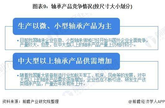 以尺寸大小分类来看,随着我国轴承技术的不断发展,目前我国轴承企业在微、小型轴承领域已经开始与国外企业全面竞争,生产量较大。但是,在中大型以上的轴承产品产量上仍相对较小。