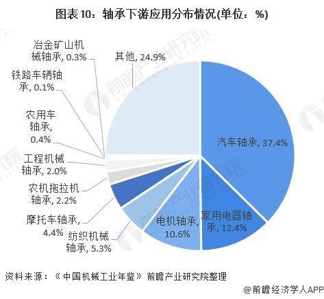 轴承的下游应用十分广泛,目前轴承主要应用于汽车行业,占比达到37%左右。其次为家用电器轴承、电机轴承和纺织机械轴承,占比分别为12%、11%和5%。