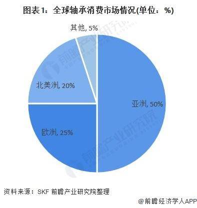 轴承是当代机械设备中一种举足轻重的零部件,它的主要功能是支撑机械旋转体,降低其运动过程中的摩擦系数,并保证其回转精度。因此,其应用范围十分广泛,市场需求旺盛。以中国、日本为代表的亚洲地区,占据了全球轴承消费的半壁江山,成为了全球最大的轴承消费市场。欧洲和北美地区紧跟随后,分别为25%和20%。