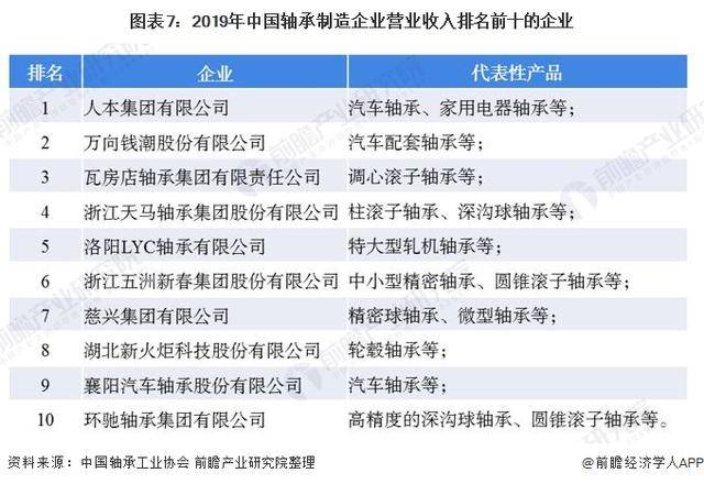 2019年,中国轴承制造企业轴承营业收入排名前十大企业的企业分别是人本集团有限公司、万向钱潮股份有限公司、瓦房店轴承集团有限责任公司、浙江天马轴承集团股份有限公司、洛阳LYC轴承有限公司、浙江五洲新春集团股份有限公司、慈兴集团有限公司、湖北新火炬科技股份有限公司、襄阳汽车轴承股份有限公司和环驰轴承集团有限公司。