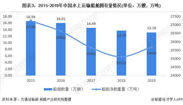 我国水上运输船舶保有量及船舶净载重量均呈波动下降态势,2019年水上运输船舶13.16万艘,净载重量25684.97万吨