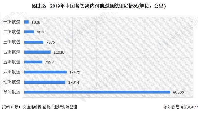 2019年我国各等级内河航道通航里程分别为:一级航道1828公里,二级航道4016公里,三级航道7975公里,四级航道11010公里,五级航道7398公里,六级航道17479公里,七级航道17044公里,等外航道里程6.05万公里。